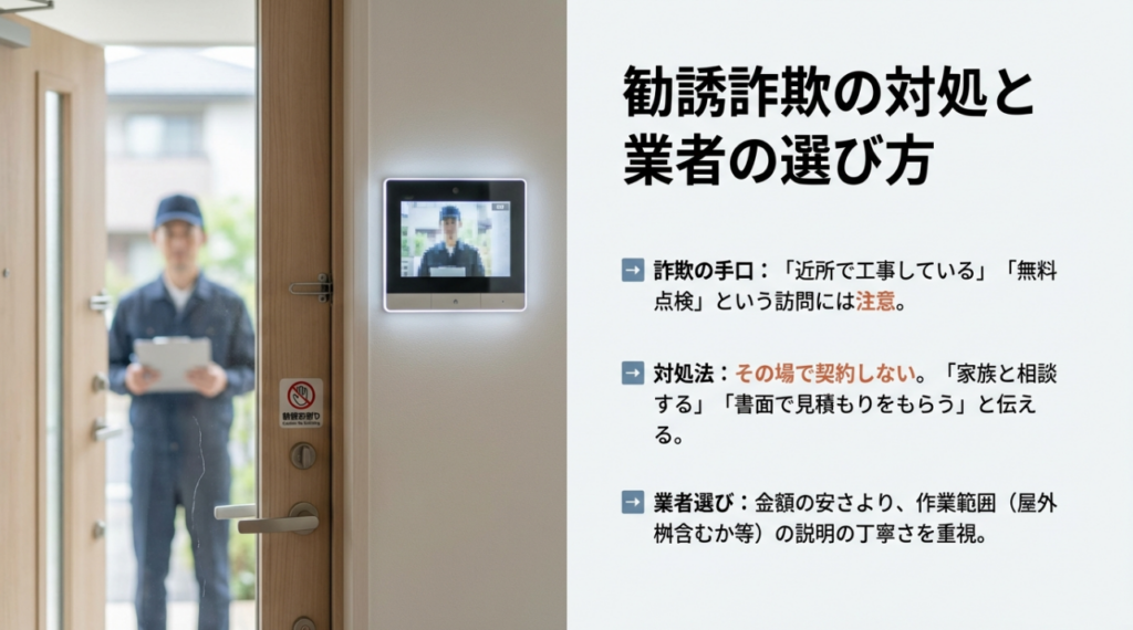 押しが強い相手ほど、曖昧な返答をすると食い下がります。私は、断るときは短く、事務的に伝えるのがいちばん安全だと思っています。たとえば「今日は対応しません」「家族と相談してから決めます」「見積もりだけでは契約しません」。この“型”があるだけで、心理的に楽になります。相手が威圧的だったり、敷地内で勝手に作業を始めようとしたりする場合は、その場で中止を伝え、必要なら公的な相談窓口へ相談してください。