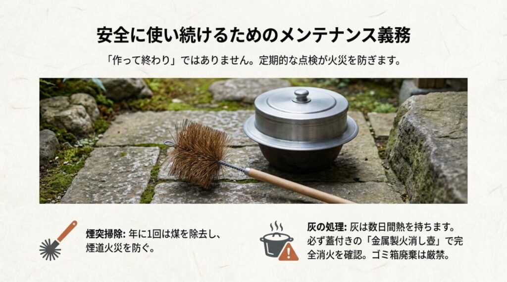 ピザ窯は「作って終わり」ではありません。車検と同じように、安全に使い続けるための定期的なメンテナンスが義務付けられていると考えましょう。