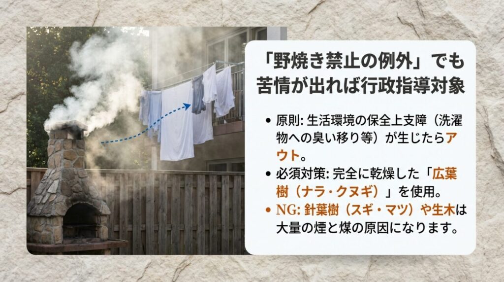 つまり、いくらレジャー目的であっても、近所から「煙たくて窓が開けられない」「喘息の子供が咳き込む」といった苦情が出れば、それは「生活環境の保全上の支障」が生じているとみなされます。この場合、役所や警察から行政指導が入り、焼却の中止を命じられる可能性があります。「法律の例外で認められている権利だ!」と主張しても、近隣の生活環境を害している事実があれば、その主張は通りません。