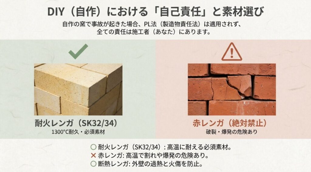 メーカー製の既製品であれば、PL法(製造物責任法)によって、製品の欠陥による事故はある程度メーカーが責任を負います。しかし、DIYで作った窯の場合、設計・施工・管理の全ての責任は施工者である「あなた」にあります。