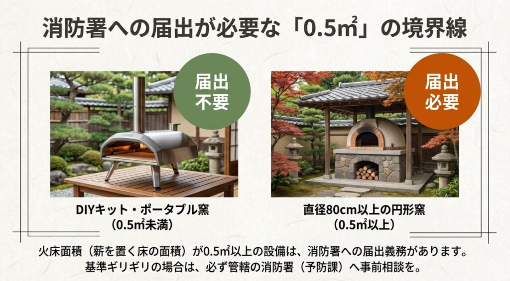 一般的なDIYキットや、持ち運び可能なコンパクトなピザ窯であれば、火床面積が0.5㎡(平方メートル)を下回ることが多いので、届出は不要な場合がほとんどです。しかし、「せっかくだからお店みたいな大きな石窯を庭にドンと据えたい!」と張り切って設計した場合、この「0.5㎡」の壁を超える可能性があります。