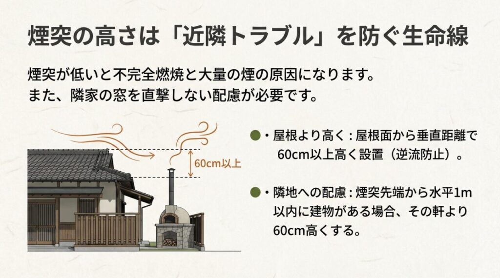 - 煙突の高さや位置は、建築基準法および近隣への煙被害防止を最優先に設計する。