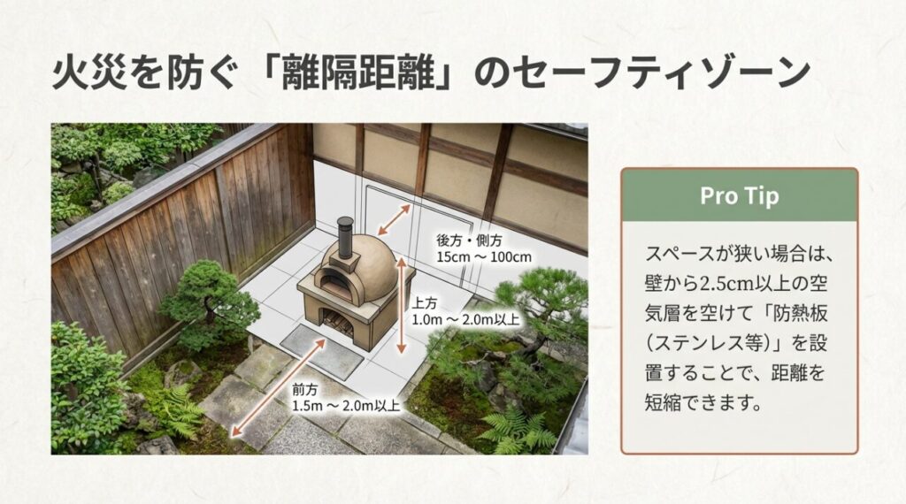 これは、熱源から放射される強力な赤外線(輻射熱)によって、周囲の壁、フェンス、樹木などの可燃物が過熱され、炭化して発火するのを防ぐための生命線となるルールです。