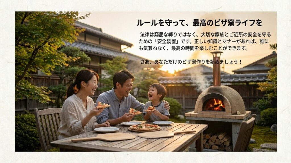 しかし、これらは全て、あなたの大切な家族、そして長く付き合っていくご近所さんの命と財産を守るための「安全装置」です。しっかりとルールを守って設置・運用すれば、誰にも文句を言われることなく、堂々と最高のピザ窯ライフを楽しむことができます。
