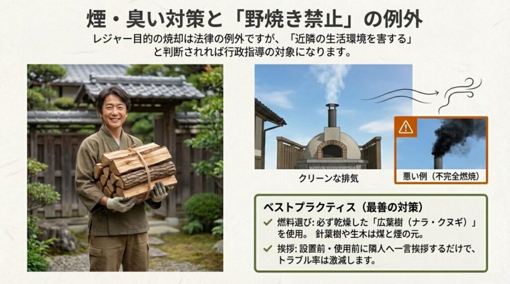 無事にピザ窯が完成し、法的な設置基準もクリアしました。しかし、本当の戦いはここからです。運用方法を間違えると、近隣からの苦情により、たった一度の使用で「使用禁止」に追い込まれてしまうこともあります。ここでは、長く楽しく使い続けるための運用ルールとマナーについて解説します。