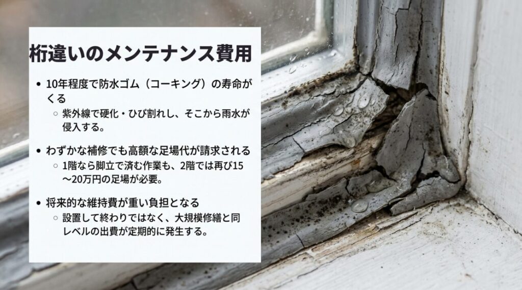 先ほどの掃除の話と同様、二階サンルームの外側(外壁との取り合い部分など)を補修するには、安全確保のために「外部足場」の設置が不可欠となります。たかが数メートルのコーキングを打ち替えるだけの作業に、足場代として15万円〜20万円が請求されることになるのです。