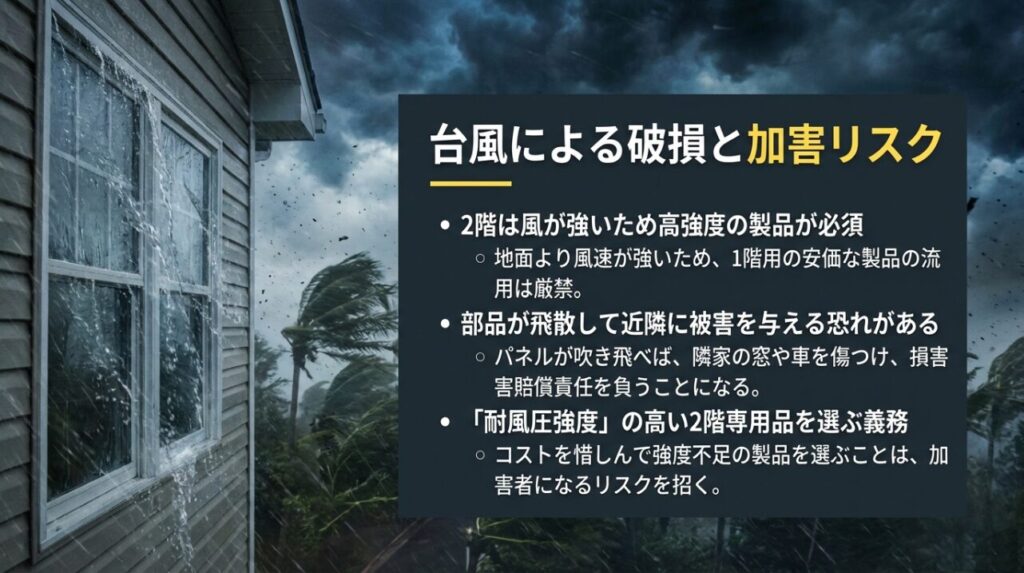 もし強風で屋根パネルが吹き飛んだり、枠組みごと崩落したりした場合、それは単なる「自宅の損害」では済みません。飛散した部材が、隣の家の窓ガラスを割ったり、駐車中の車を傷つけたり、最悪の場合は通行人に当たって大怪我をさせてしまう可能性があります。その場合の損害賠償責任は、設置した所有者が負うことになります。「風が強かったから仕方ない」では済まされないのです。二階に設置する以上、コストがかかっても最高ランクの強度を持つ製品を選ぶことは、所有者としての義務と言えるでしょう。
