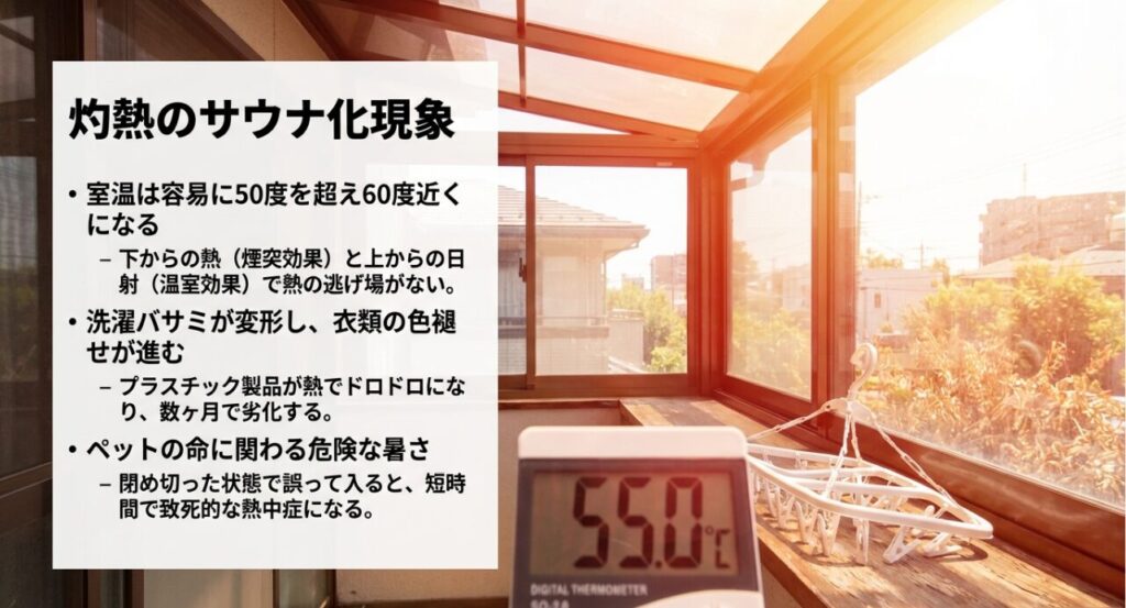 この「下方からの熱の蓄積」と「上方からの日射取得」のダブルパンチにより、真夏の日中は外気温が30℃台であっても、サンルーム内部の温度は容易に50℃を超え、時には60℃近くに達することさえあります。