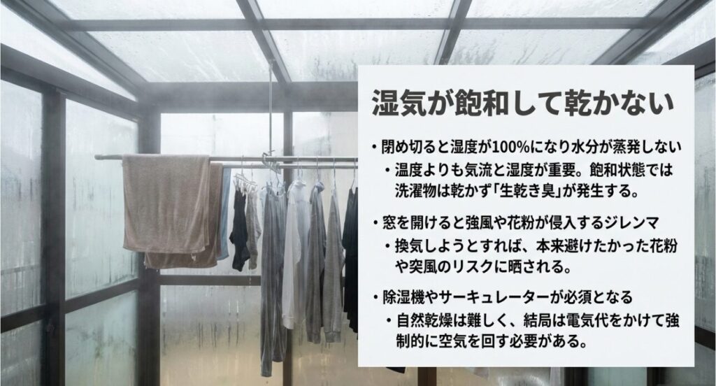 洗濯物が乾くという現象は、衣類に含まれる水分が蒸発して空気中へ移動することを指します。この移動をスムーズに行うためには、周りの空気が乾燥している(水分を受け入れる余裕がある)必要があります。しかし、「花粉やPM2.5を入れたくないから」「雨が降りそうだから」といってサンルームの窓を完全に閉め切ってしまうと、衣類から出た水分だけで狭いサンルーム内の湿度は一気に100%近く(飽和状態)に達します。