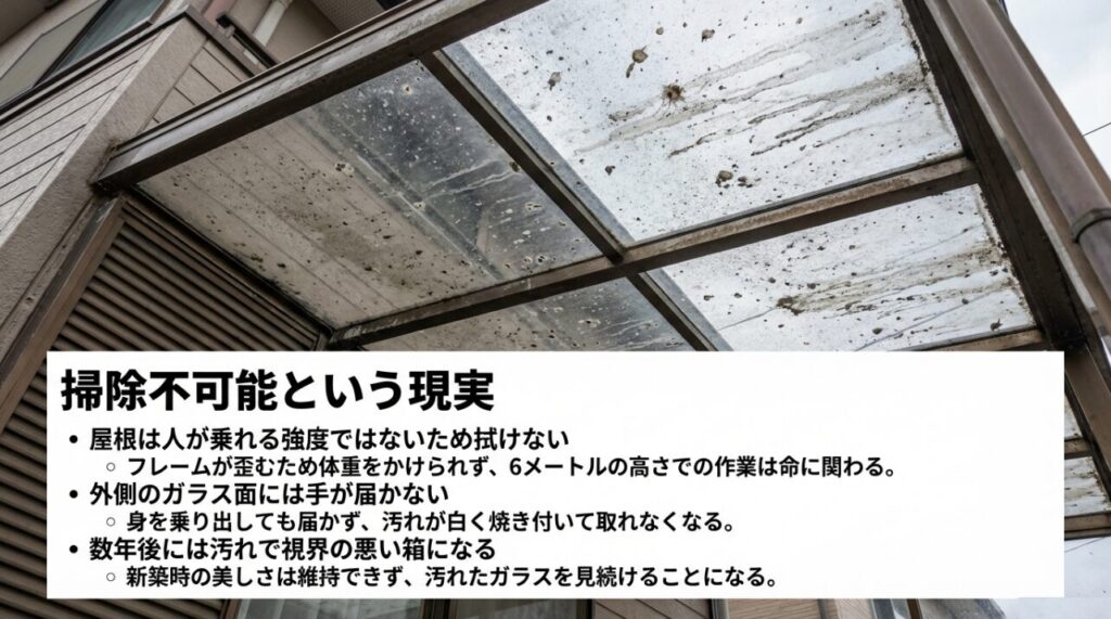 結果として、多くのご家庭で「汚れても危険だから見て見ぬふりをする」という状況に陥ります。新築時はキラキラしていたサンルームが、数年後には薄汚れた視界の悪い箱になってしまう。この「美観の維持管理ができない」という点は、長く住む家として非常に大きなデメリットと言えるでしょう。