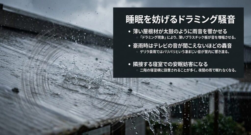特に問題なのは、二階のバルコニーは寝室や子供部屋に隣接しているケースが多いということです。夜中に激しい雨が降ると、その轟音で目が覚めてしまったり、怖くて眠れなくなったりするご家族がいらっしゃいます。一度設置してしまうと、屋根に防音シートを貼るといった対策も(高所作業のため)容易ではなく、長年にわたって睡眠環境を脅かすストレス要因になりかねません。