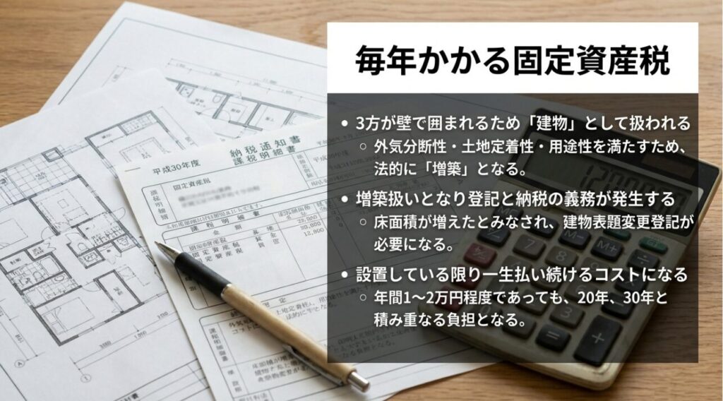 設置後のコストとして、最も多くの方が見落としているのが「税金(固定資産税)」の問題です。