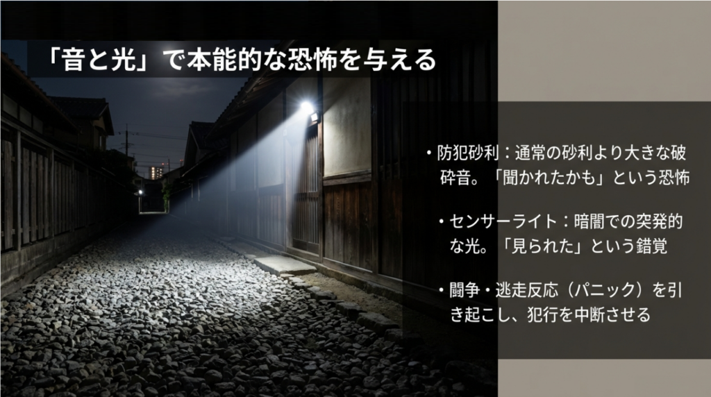 物理的に窓やドアを固めるだけでなく、犯罪者の心理に直接プレッシャーを与える設備も非常に効果的です。人間の脳は、予期せぬ大きな音や急な強い光を浴びると、本能的に「危険だ」と察知して闘争・逃走反応(パニック)を起こします。この防衛本能を逆手に取るのが、防犯砂利とセンサーライトです。家の裏側や死角になりやすい勝手口までの通路に防犯砂利を敷き詰めておくと、上を歩いたときに「ジャリジャリ!」という通常の砂利とは比較にならないほど大きな破砕音が鳴り響きます。静かな住宅街において、この音は泥棒にとって致命的なアラートとなり、「誰かに聞かれたかもしれない」という強烈な恐怖を植え付けることができます。