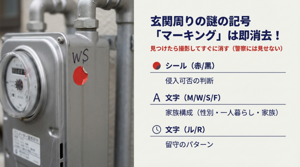 マーキングを発見したら、まずはスマートフォンなどで写真を撮って客観的な証拠を残し、その後すぐにシール剥がしや水洗いで完全に消去してください。即座に消すことで、「この家は警戒レベルが高い」と犯人に認識させ、ターゲットから外させる効果があります。