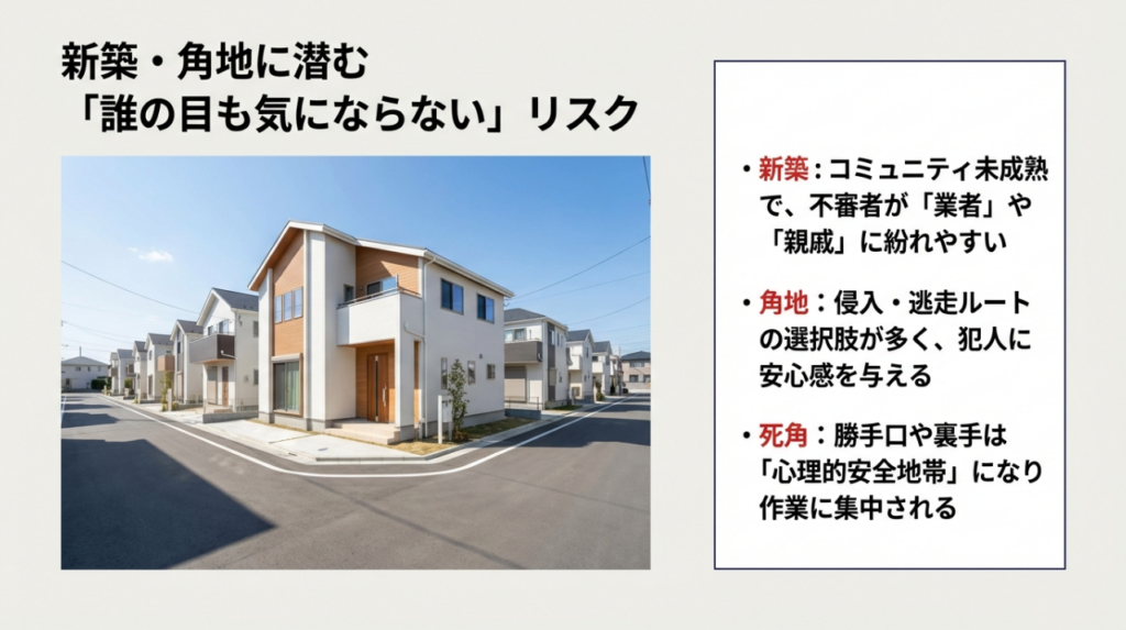 日当たりが良く、開放感があって不動産市場でも非常に人気の高い角地ですが、防犯の観点では道路に二面以上接しているため、空き巣にとっては「侵入ルートと逃走ルートの選択肢が多い」というメリットを与えてしまいます。人間は(泥棒も同様に)「逃げ道が複数ある」と認識した途端に、心理的な安心感を得て大胆な行動を取りやすくなります。また、通行人を装って家の様子をさりげなく観察しやすいという点でも、下見の対象としてターゲットにされやすい傾向があります。