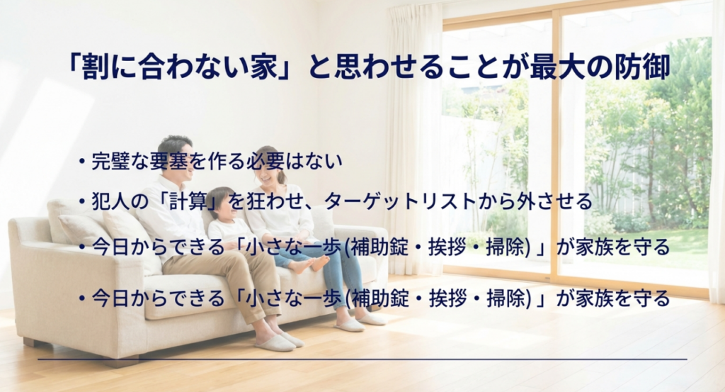 彼らは常に「いかに捕まらずに、楽に目的を達成できるか」という費用対効果を冷静に計算しています。だからこそ、私たちの防犯対策も「彼らの計算を狂わせる」という視点を持つことが重要なんです。