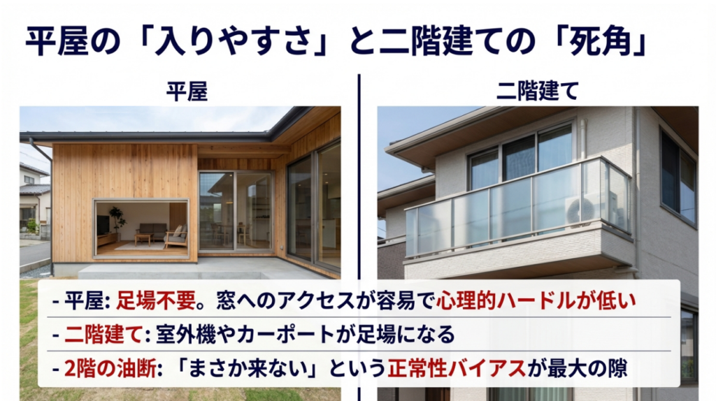 - 平屋:すべての開口部が1階に集中しているため、窓やドアへのアクセスが容易で犯行のハードルが低い。