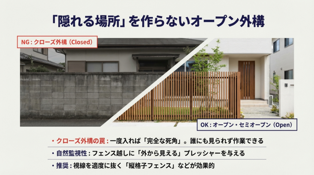 泥棒が一番嫌がるのは、警察でも防犯カメラでもなく、「ご近所や通行人の目」です。外から家の様子がある程度見える「オープン外構」や「セミオープン外構」を取り入れることは、「自然監視性」と呼ばれる防犯環境設計の基本です。泥棒からすれば、フェンス越しに外から丸見えの状態で窓ガラスを割る作業をするのは、いつ誰に通報されるかわからないという極度のプレッシャー(認知的な過負荷)を伴うため、費用対効果が合わないと判断して諦める確率が跳ね上がります。もしこれから外構を考えるなら、完全に視線を遮るのではなく、縦格子のフェンスを採用して「見えそうで見えない、でも人がいれば動きは分かる」くらいの適度な抜け感を作るのが、結果的に最も合理的な防犯対策になるかなと思います。
