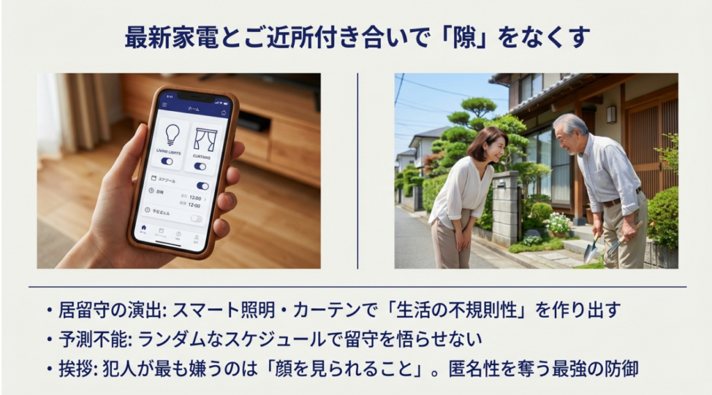すれ違った時に挨拶を交わすだけで、「この地域は住民同士の連帯感が強く、見知らぬ人間がウロウロしているとすぐバレる」という最高レベルの防犯バリアを張ることができます。ハード面の強化だけでなく、こうした人間関係というソフト面の強化も意識してみてください。