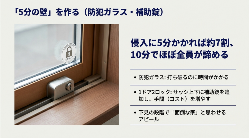 空き巣の侵入経路として最も多いのが「窓」であり、次いで「玄関」や「勝手口」です。実は、彼らは行き当たりばったりでガラスを割っているわけではありません。統計上、泥棒は侵入に5分以上かかると約7割が諦め、10分以上かかるとほとんどが諦めるというデータがあります。(出典:警察庁『住まいる防犯110番』)。泥棒にとっての「時間」は、発見されて逮捕されるリスクに直結する最大のコストです。したがって、この「5分の壁」を意図的に作り出すことが、最も理にかなった防犯対策と言えます。